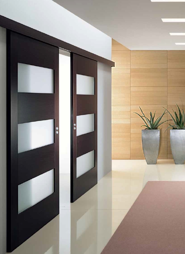 - из дерева, используемого как массив или шпон. Популярны створки, произведённые с применением дуба, ясеня, экзотических пород, которые в естественном виде имеют насыщенный оттенок. Благородная, аристократическая красота чёрных раздвижных дверей уместна в интерьерах любого дизайна;