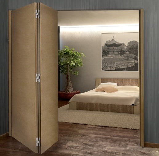 - высокий уровень компактности. Особенность сдвижной двери-книжки в том, что для полноценной работы ей не нужна стена. Полотно перемещается внутри проёма, а значит, его можно интегрировать в узкий коридор или угол комнаты;
