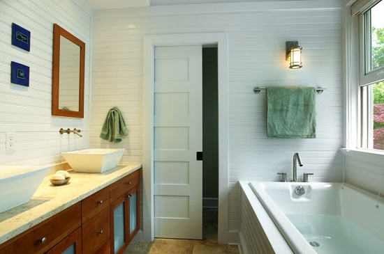 - сантехнических помещений, проёмы которых не во всех случаях обладают параметрами, достаточными для установки стандартных створок. Даже при оформлении квартир типовой застройки хозяева сталкиваются с необходимостью покупки изделий шириной 50 и 55 см;